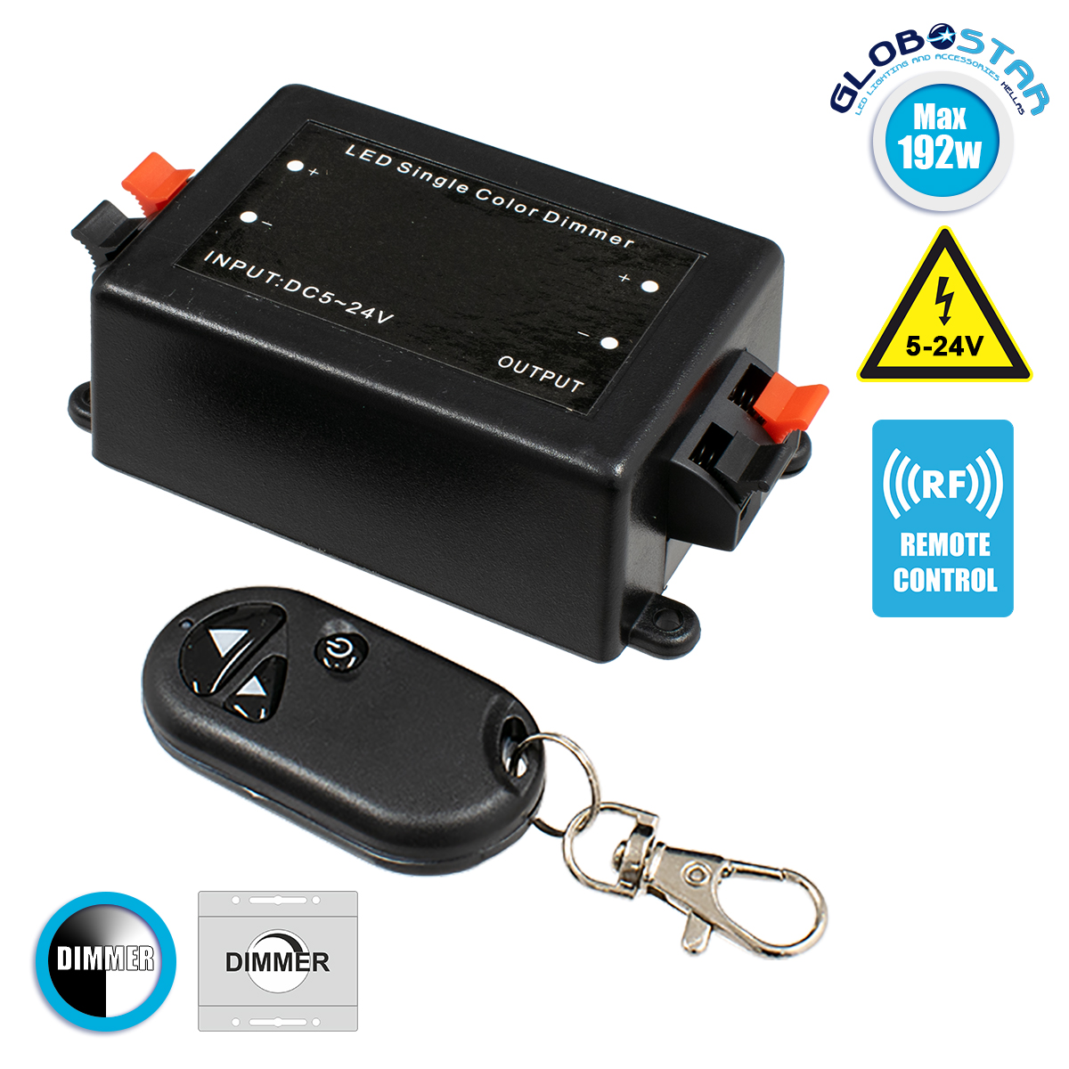 GLOBOSTAR® DIMMERME 73309 Dimmer με RF Ασύρματο Χειριστήριο με 1 x 8A 192W Κανάλι DC 5-12-24V 8A 192W Max IP20 – RF2.4Ghz – Μ11.5 x Π5.7 x Υ3.4cm – 2 Χρόνια Εγγύηση